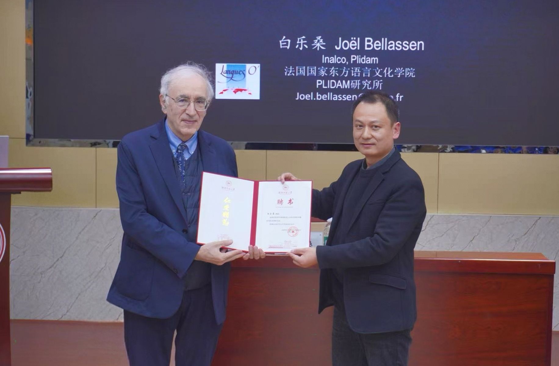 讲座开始前,沈敏副院长向白乐桑教授颁发聘书,聘请其担任湖南师范大学汉语国际传播研究院客座研究员。