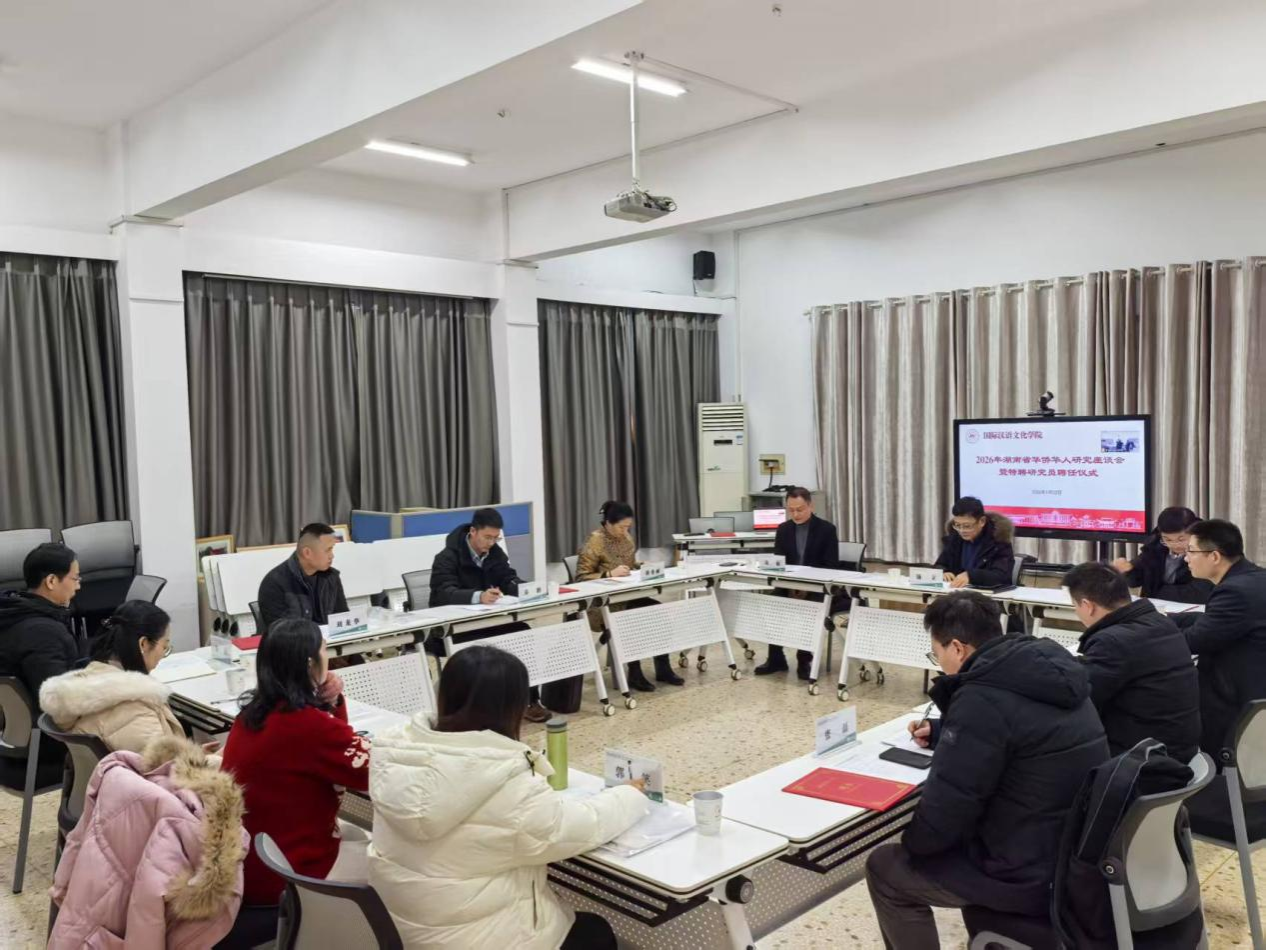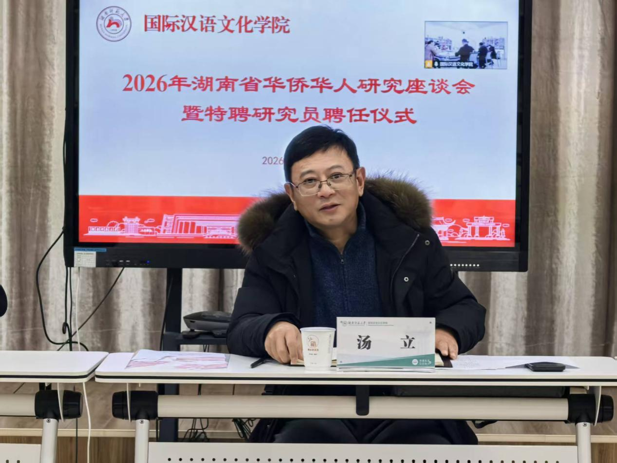 (通讯员 陈志亨)1月22日,2026年湖南省华侨华人研究座谈会暨特聘研究员聘任仪式在田家炳教育书院114室举行。湖南省侨联二级巡视员汤立、我校副校长唐贤清出席会议。座谈会由我院副院长唐秀丽主持。